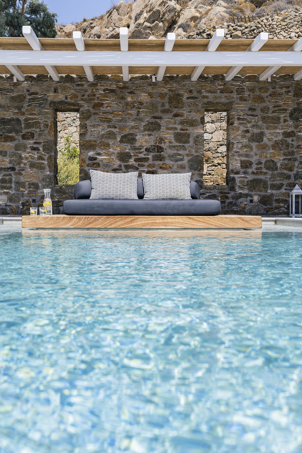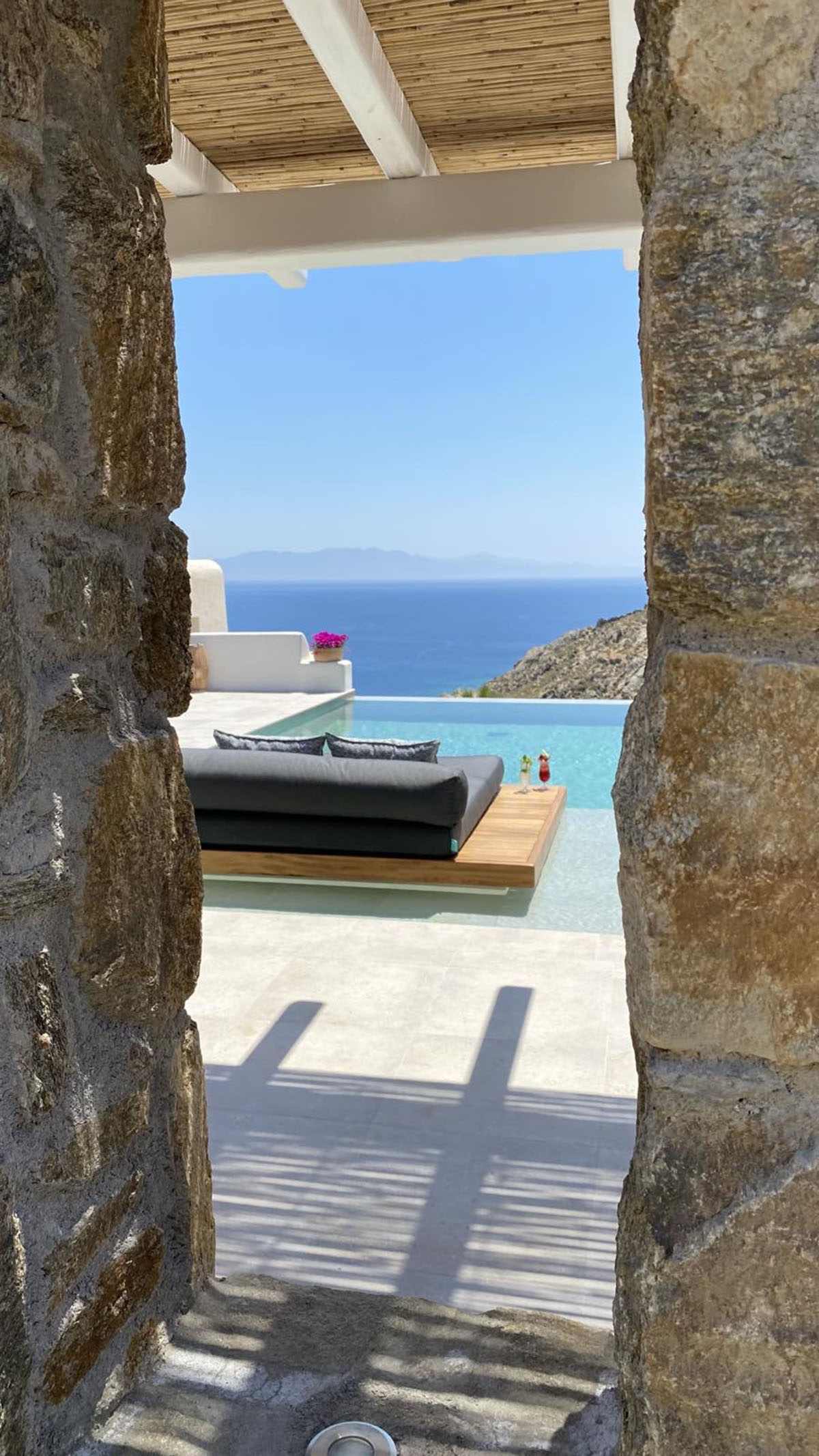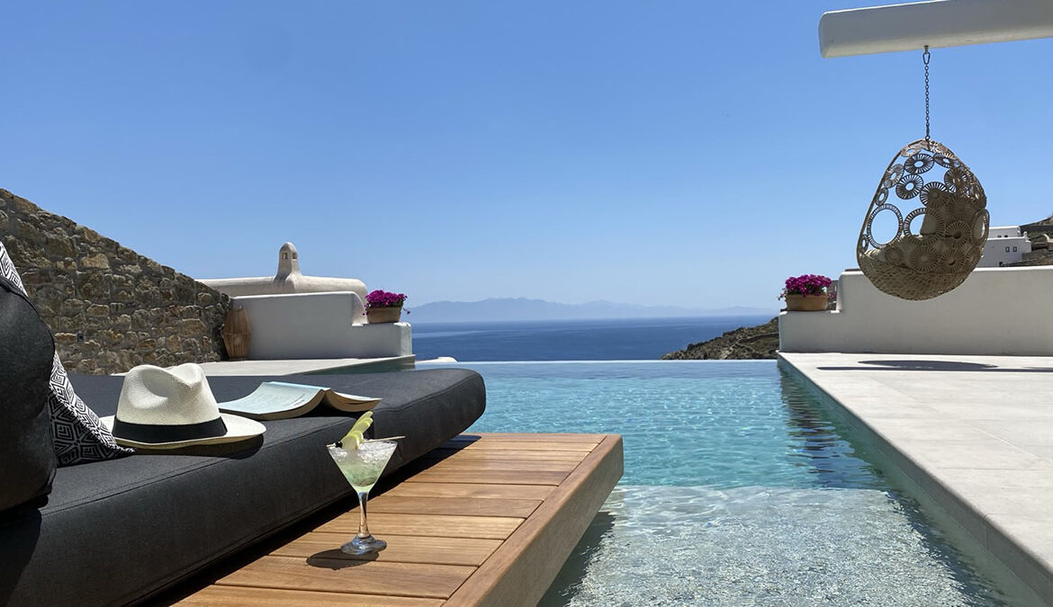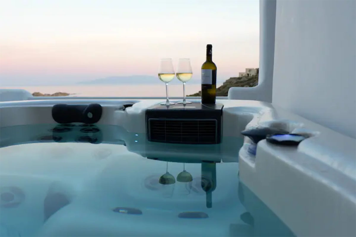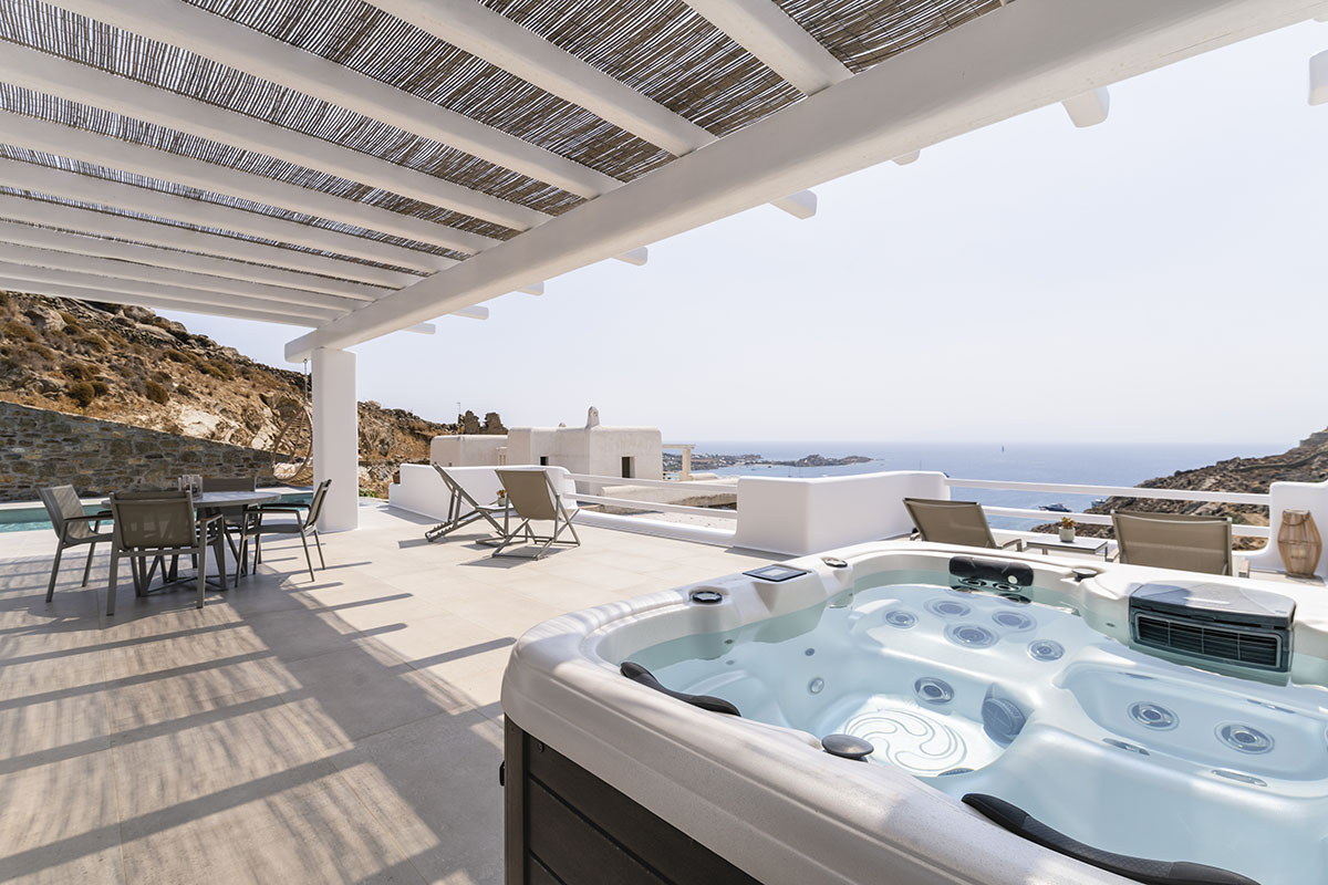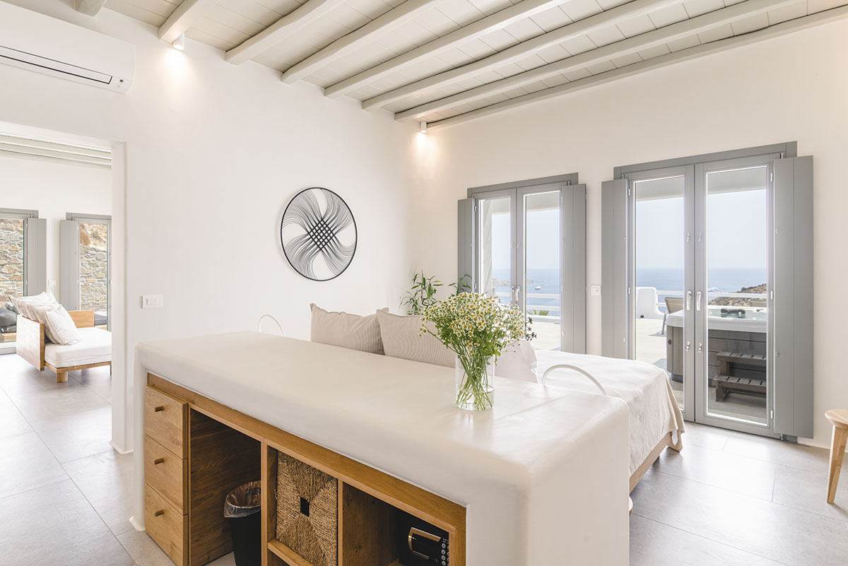 Step outside to discover the villa’s highlight: a private outdoor area with both a sparkling jacuzzi and pool. Here, you can unwind in the soothing waters while soaking in the magnificent views of Psarou Beach and the endless blue of the Aegean. The spacious terrace, complete with comfortable lounge and dining areas, is ideal for enjoying romantic sunsets or peaceful mornings.
