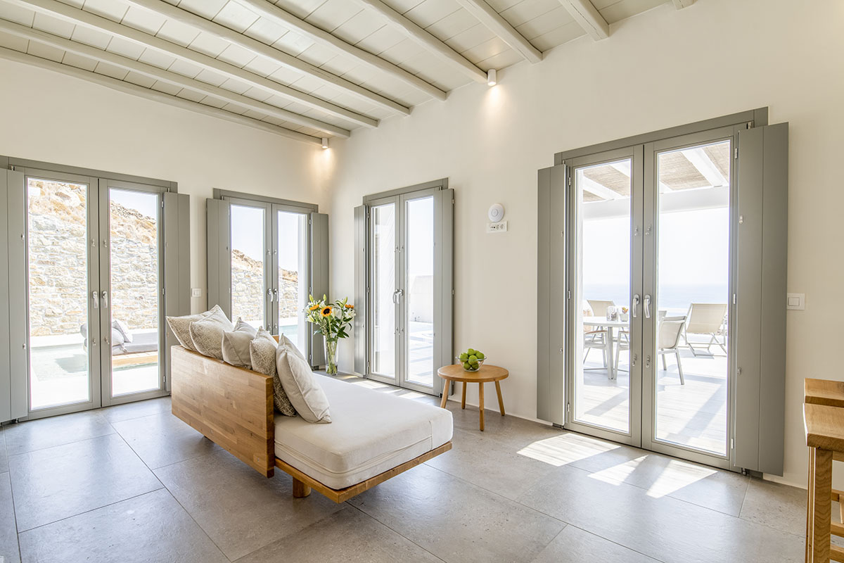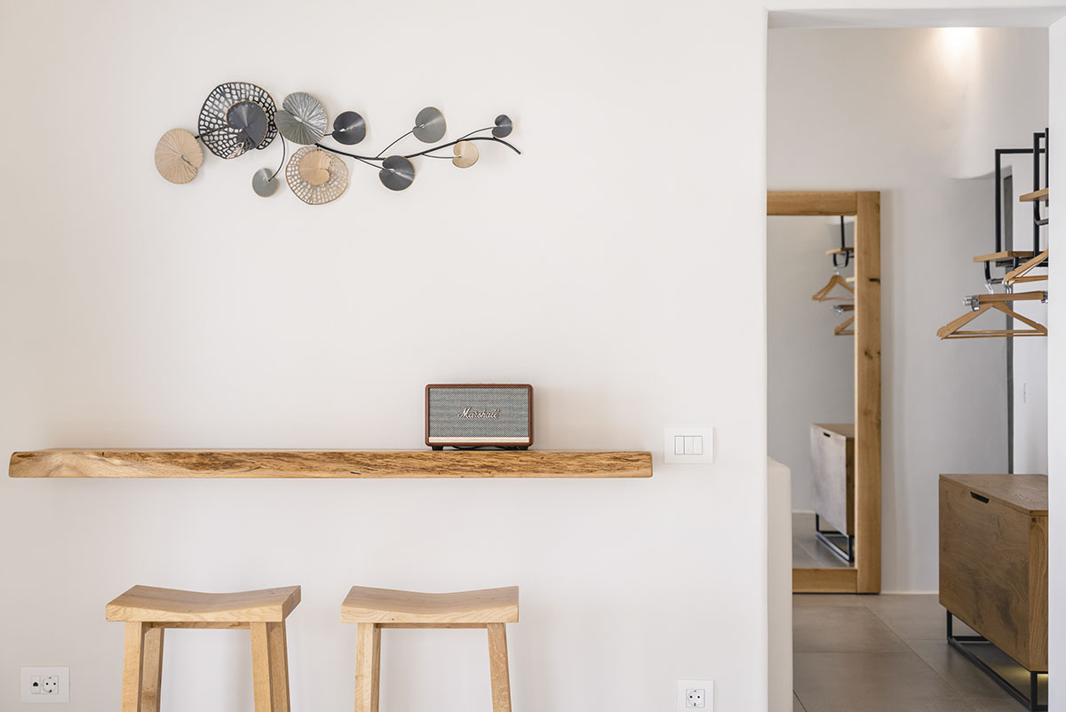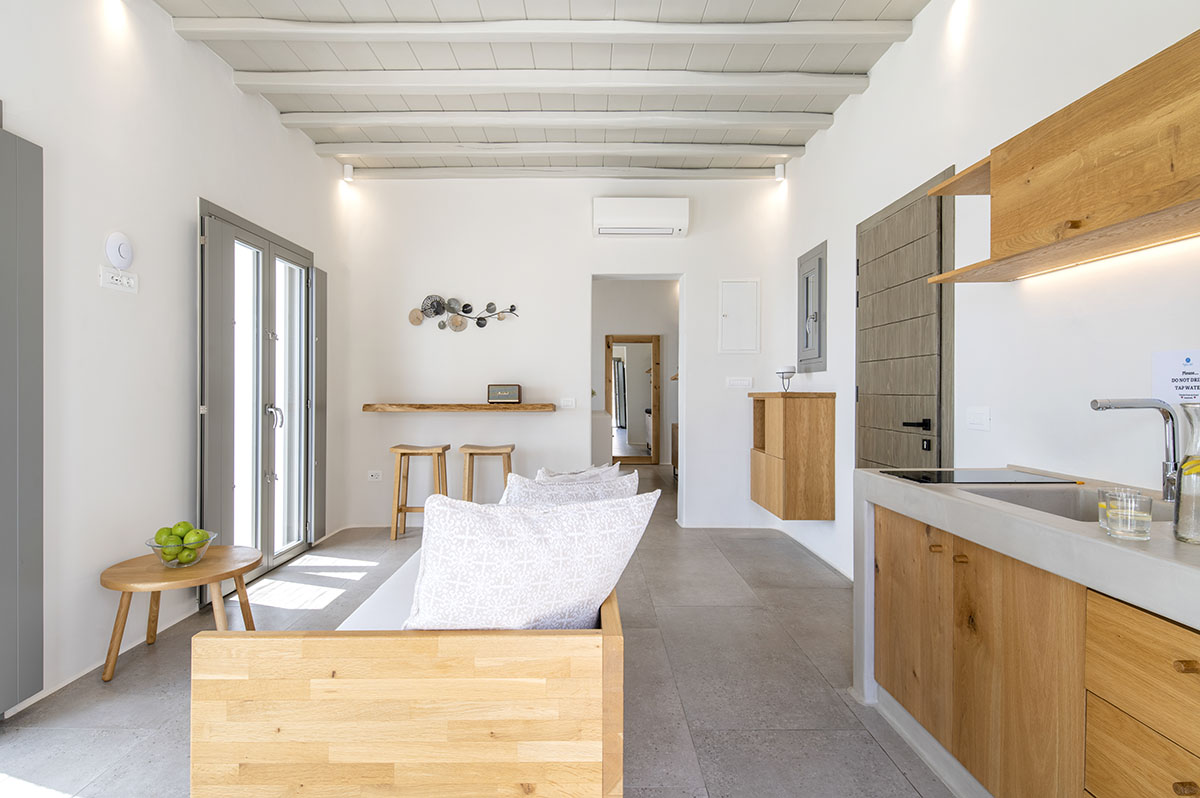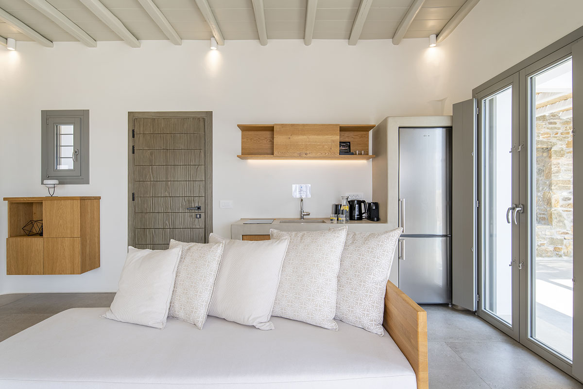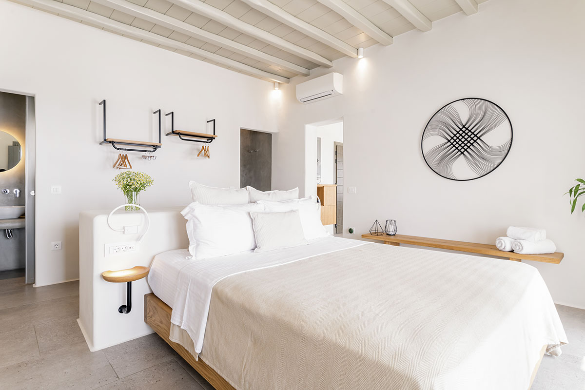 Designed in the timeless Cycladic style, the villa features minimal yet elegant decor that complements its serene surroundings. Inside, the cozy bedroom and thoughtfully arranged living spaces create a warm and welcoming atmosphere.